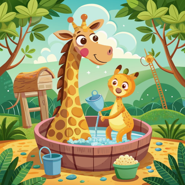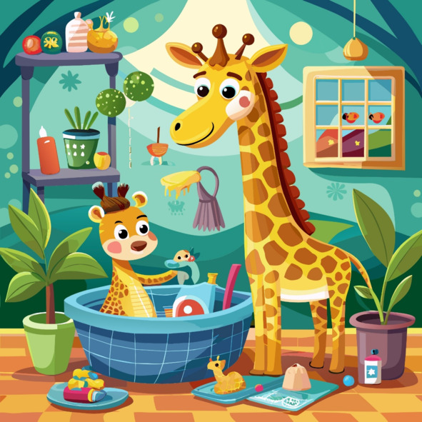 В самом сердце своего уютного дома в джунглях Пенни, нежная мама-жираф, решила, что пришло время принять расслабляющую ванну. Радостно напевая и приплясывая, она направилась к большой сверкающей ванне, примостившейся в углу их ванной комнаты.