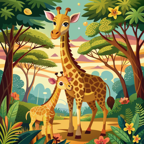 В самом сердце пышных зеленых джунглей стоял уютный маленький домик, приютившийся среди высоких деревьев. Это был не просто дом; это был дом особого семейства жирафов. Высокие и грациозные, с шеями, тянущимися высоко в небо, они с нежной элегантностью бродили по джунглям.