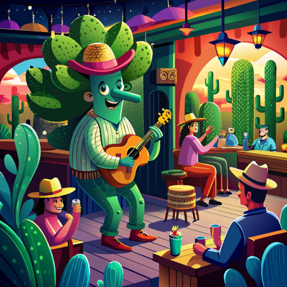 В самом сердце Техаса, уютно устроившись между пыльными улицами и звездным небом, находился оживленный местный бар, известный как «Салун Сагуаро». И именно здесь, в этом уютном заведении, наш предприимчивый друг-кактус Хавьер провел немало вечеров, наигрывая сладкие мелодии на своей любимой гитаре.