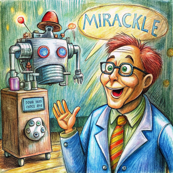 Воздух в мастерской профессора Итана был насыщен запахом масла и металла, знакомым ароматом изобретений. Чудо-молочная машина приближалась к завершению. Его гладкий серебристый корпус, свидетельство упорного труда и мастерства профессора Итана, гордо возвышался на его рабочем столе. Колеса блестели в свете лампы, а тщательно отполированные шестеренки жужжали и щелкали, каждая из которых обещала волшебное преображение.