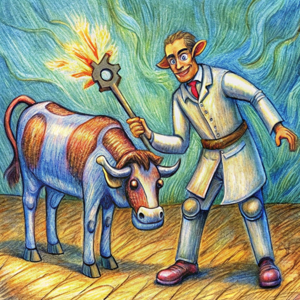 Сегодня глаза профессора Этана искали с новообретенной настойчивостью. В его голове вертелся эскиз Чудо-молочной машины. Он визуализировал каждую шестерню, каждый рычаг, каждую металлическую панель, представляя, как великолепное чудовище оживает. Он осмотрел груды металла, надеясь найти нужные детали, идеальные ингредиенты для своего нового проекта.