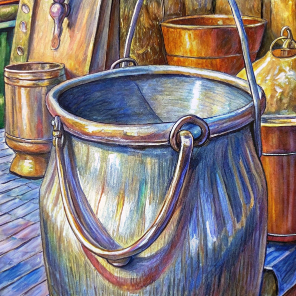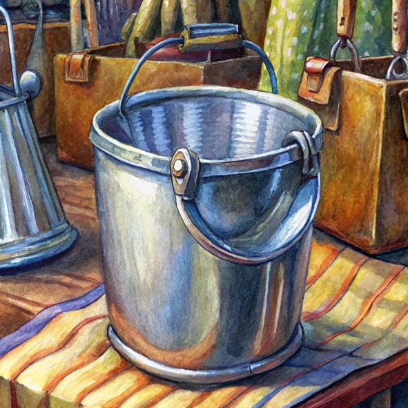 И тут он увидел это! В пыльном углу, под кучей старых абажуров, стояло ведро. Заметьте, не просто ведро. Оно было сделано из сверкающего серебра, гладкое и блестящее, как новенькая монета. Оно выглядело точно так же, как ведро на эскизе.