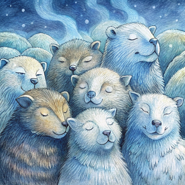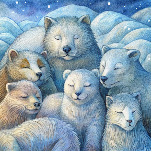 Семейство песцов, мех которых такой же белый, как окружающий снег, прижимаются друг к другу, их тела дрожат от пронизывающего холода. Они прижимались друг к другу, шепча истории о прошедшем лете, истории, которые, казалось, принадлежали другому, более счастливому миру. Они тосковали по аромату летних цветов, по теплу солнечных лучей и возможности еще раз потанцевать в радостном кругу под великолепным солнцем.