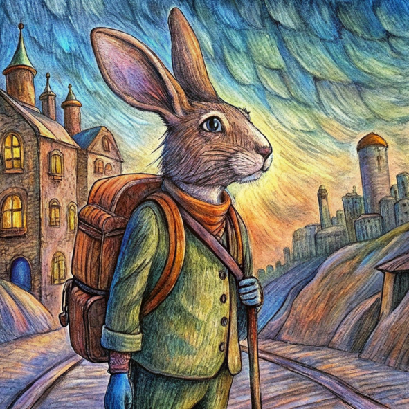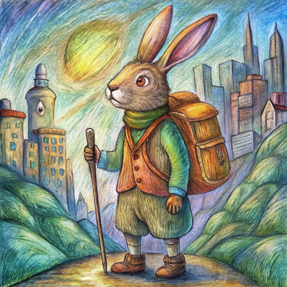 В самом сердце шумного города, уютно устроившись между пекарней со сладким ароматом и шумным магазином игрушек со звенящими колокольчиками, жил кролик по имени Джулиан. Он не был обычным прыгающим кроликом, жующим морковь. О нет, Джулиан был путешественником, мечтателем, искателем приключений с ненасытным любопытством к миру за пределами его городских стен.