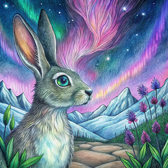 Но для Джулиана, юного путешественника-кролика, зрелище полярного сияния было лишь мимолетным чудом. Он наблюдал за этим захватывающим представлением, на мгновение завороженный, прежде чем им овладело глубокое желание.