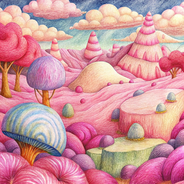 Гигантские розовые леденцы, посыпанные сверкающими кристаллами сахара, плыли, как гигантские съедобные облака. Огромные плюшевые розовые подушки плавали вокруг, как надувные, а сладкие шарики из розовой сахарной ваты кружились, как причудливые балерины.