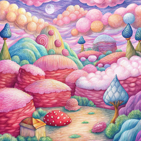 Вокруг нее закружился головокружительный водоворот сладковатого хаоса. Пушистые розовые грибы превратились в гротескные формы, розовые леденцы покачивались на похожих на палочки стеблях, проросших из покрытой ирисками земли. Облака, на которые она наткнулась, превращались в чудовищные тучи, их цвета растворялись в оттенках пугающего неоново-фиолетового.