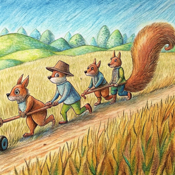 Маленькие белочки тянули и толкали друг друга своими пушистыми лапками. Они представляли собой потрясающее зрелище – четыре пушистые белки, тянущие мини-плуг, в то время как Ти Джей, взгромоздившись на него, руководил их усилиями с яростной решимостью.