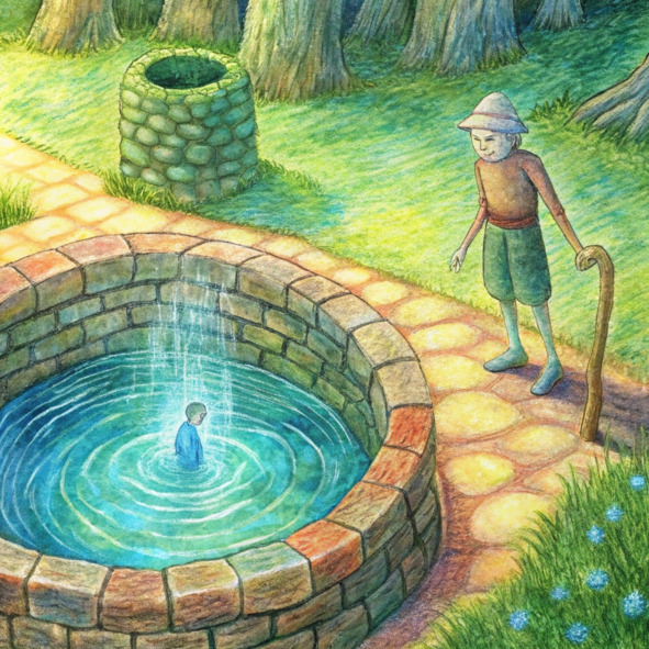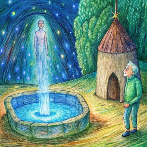 Он открыл глаза. Вода в колодце мерцала, не прозрачная, но наполненная крошечными искорками. Затем, к изумлению Карсона, из колодца начала подниматься маленькая морщинистая фигурка!