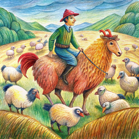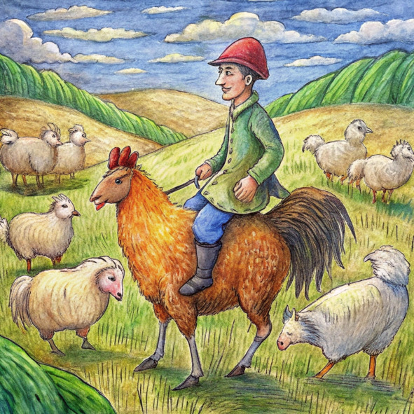 Он скакал верхом на гордом петухе по кличке Барнаби, как миниатюрный жокей, его крошечные ножки энергично дрыгались, когда Барнаби скакал галопом по ферме. Другие цыплята подняли головы и закудахтали от изумления: петух тащил человека – такого зрелища они никогда раньше не видели.