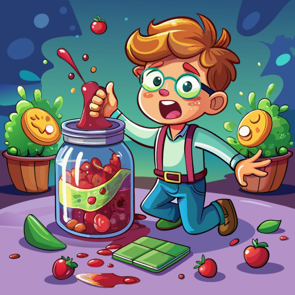 To his surprise, he found an open jar of jam, its lid askew, and a few sticky drops dribbling down the sides. Leo’s nose twitched at the sweet scent of strawberries that wafted from within the jar.