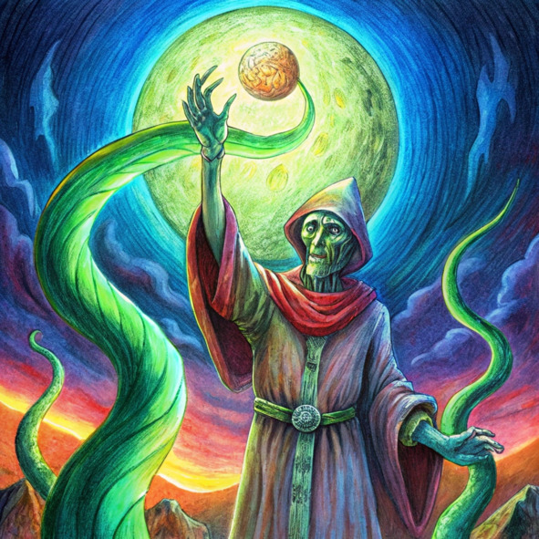 Джонатан, уже не просто человек, а сила природы, возвышался в самом сердце заброшенного храма. В его глазах, светящихся зеленым, отражалась изумрудная луна, тяжело висевшая в небе. Он слился с Genesis, его первобытная сила текла по его венам, придавая силы каждому дюйму его существа.