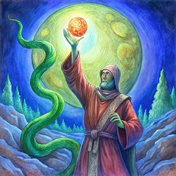Из ослепительного изумрудного света материализовалась фигура – змея, но не похожая ни на одну змею, которую он когда-либо видел. Он мерцал тем же изумрудным сиянием, что и породивший его свет, его чешуйки переливались всеми цветами радуги, каждая из которых отражала мириады меняющихся оттенков. Это было существо чистой энергии, необузданной мощи, его глаза, озера расплавленного золота, горели с первозданной интенсивностью.