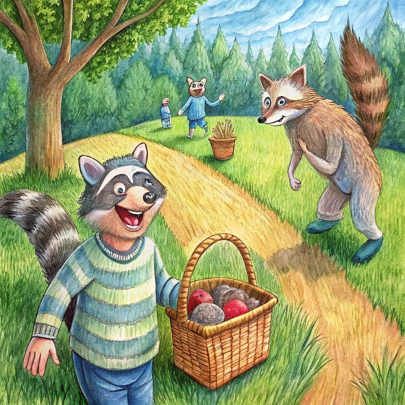 Он как раз собирался откусить от яблока, когда увидел забавную маленькую тень, метнувшуюся между кустами. Это был енот!