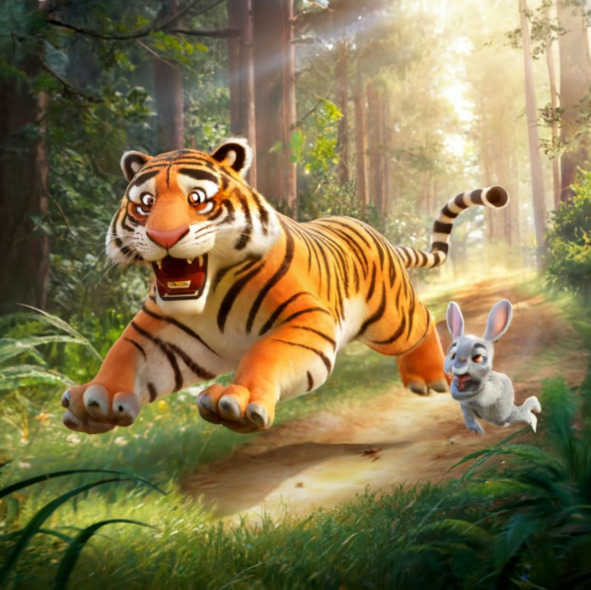 В пышном зеленом лесу, где высокие деревья шептали секреты ветру, а солнечный свет танцевал сквозь листву, жил величественный тигр по имени Пол. Он был известен повсюду своими яркими оранжевыми и черными полосами, своим мощным ревом, который эхом разносился по деревьям, и, самое главное, своим игривым характером и добрым сердцем.