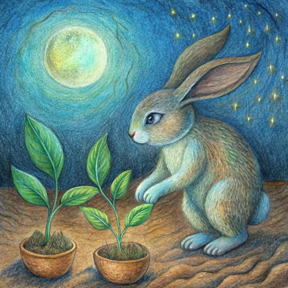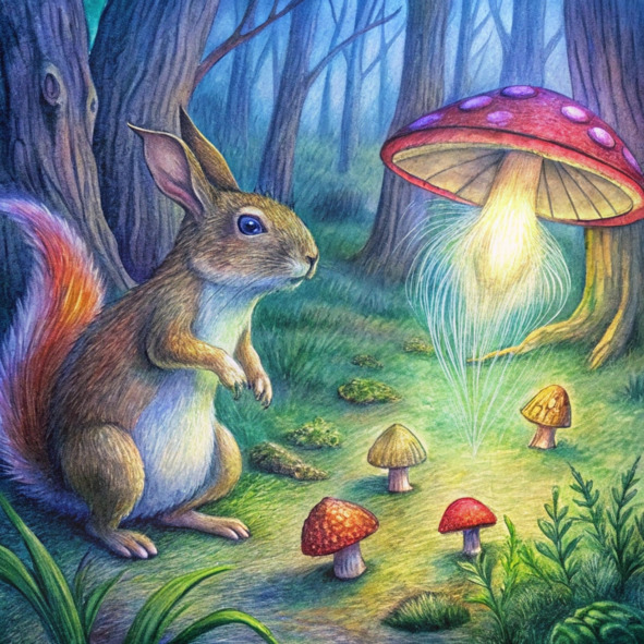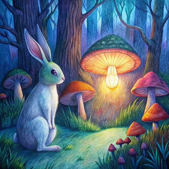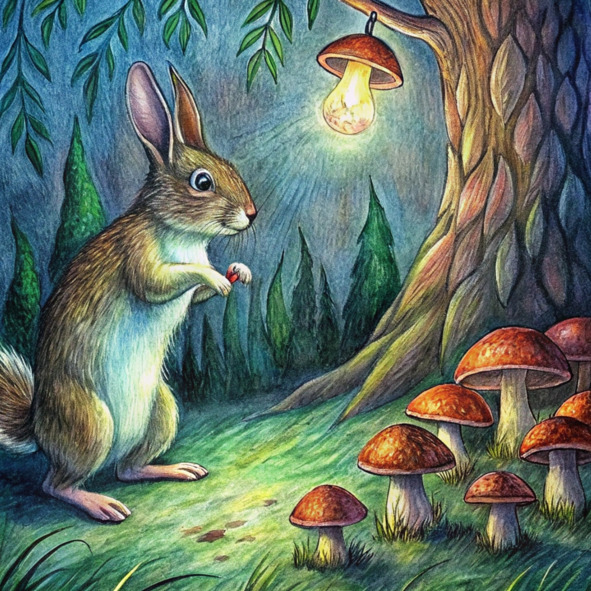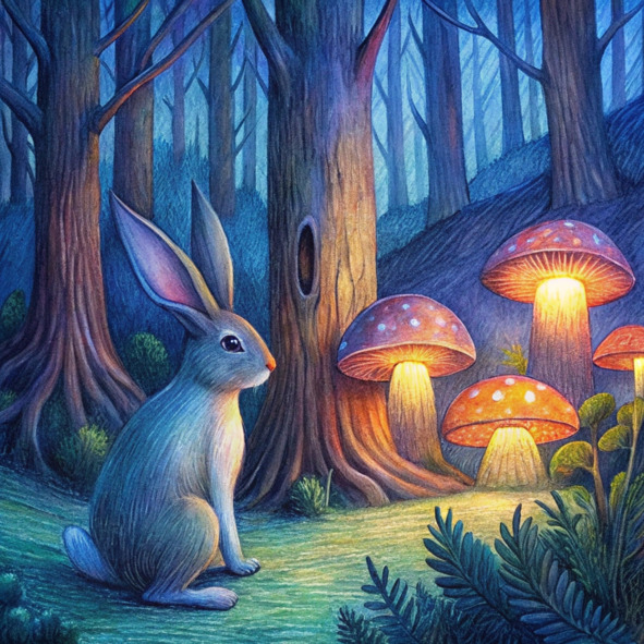 Арон, озорной кролик с мехом, белым, как свежевыпавший снег, прыгал по залитому солнцем лесу, его нос подергивался от возбуждения. Воздух был наполнен сладким ароматом сосновых иголок и щебетом невидимых птиц. Сегодня был тот самый день! Наконец-то он посадил свои волшебные грибы в самом сердце леса.