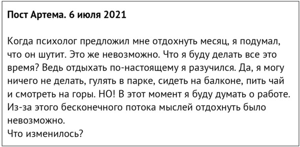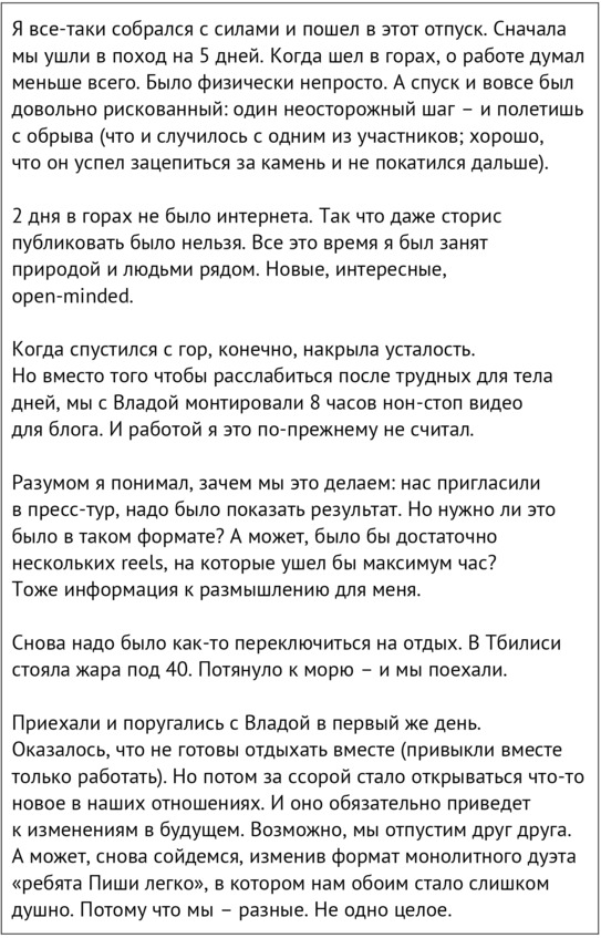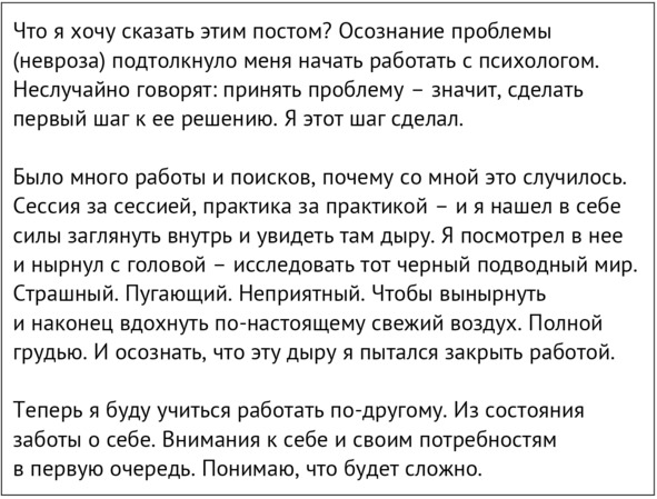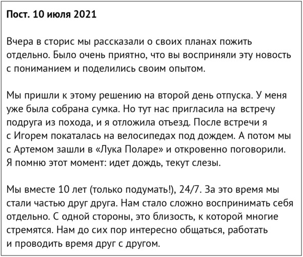 За что я люблю социальные сети, так это за то, что в них сохраняются мысли и события. Ты можешь вернуться к старым постам даже через несколько лет и перечитать их. Я никогда после расставания не перечитывала посты того времени. Это было слишком больно. Вернулась к ним впервые сейчас, спустя три года, чтобы включить их в эту книгу, и удивилась: насколько же чувства Артема тогда совпадали с моими. Как будто мы и правда были одним целым до этого решения. Даже сравнения он использует такие же.