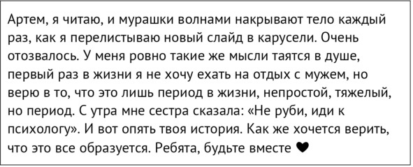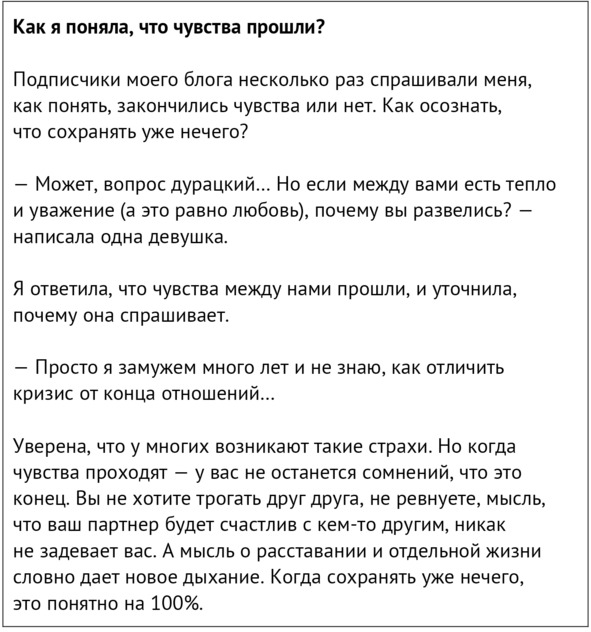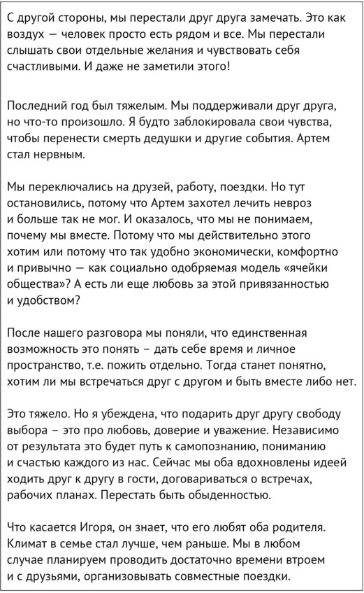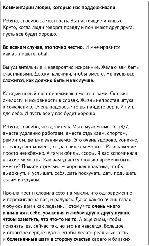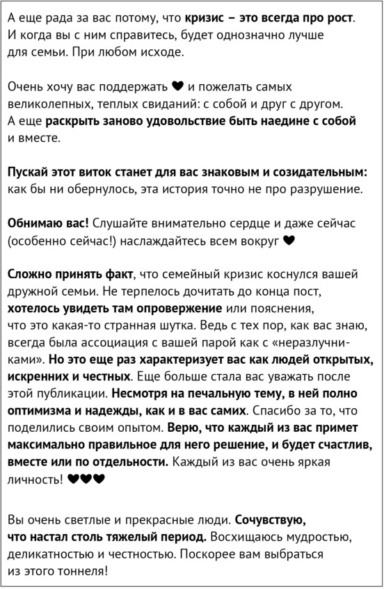 Слова поддержки от знакомых и незнакомых людей действовали на меня как заживляющий бальзам – капля за каплей. Я до сих пор благодарна каждому, кто переживал за нас, делился мыслями и принимал наше решение, даже если оно и вызывало печаль. Мнения, высказанные в такой деликатной форме, бережно и уважительно, были частью восстановительной терапии. Думаю, что именно такие слова хочется слышать от друзей и близких, когда рассказываешь о расставании. Я специально выделила слова, которые в тот период были особенно важны.