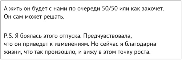 А мне не хотелось поливать грязью отца своего ребенка и человека, с которым у меня было столько хорошего. Ведь это было все равно что поливать грязью себя, нашу жизнь и свой выбор. Больше всего хотелось просто спокойного принятия ситуации.