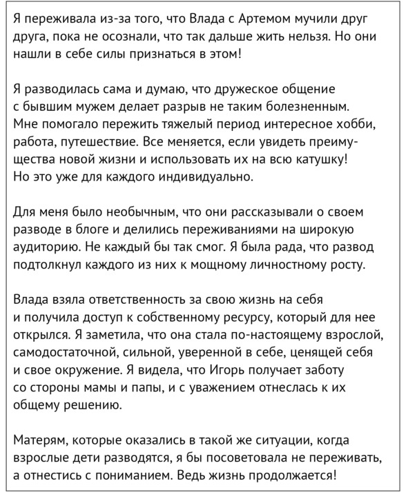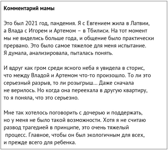 К сожалению, с мамой мы в тот период не общались и не могли обсудить происходящее, но она следила за мной в соцсетях. Через несколько месяцев после моего переезда в отдельную квартиру мы обо всем поговорили. Я попросила маму поделиться ее ощущениями и мыслями о моем разводе для книги. К тому же она сыграла в этом важную роль: по моей генеральной доверенности представляла меня на заседании суда о бракоразводном процессе. Но об этом я расскажу позже.