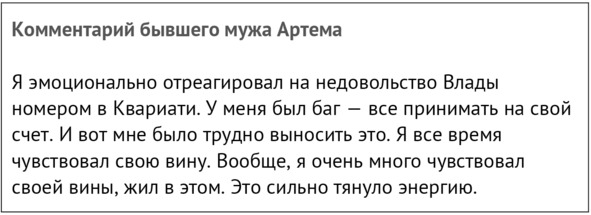 Обвинения в адрес Артема и комментарии в стиле «я всегда знала, что вы не пара: Влада заслуживает лучшего» или «симпатичная девушка в Грузии долго одна не останется, а он еще локти кусать будет, ха-ха» мне на тот момент тоже не помогали. При всем чувстве обиды и боли мне не хотелось обесценивать почти 10 лет отношений между нами. Но это показало мне, что мы все подсознательно хотим выбрать виноватого и встать на чью-то сторону. Ведь так легче!