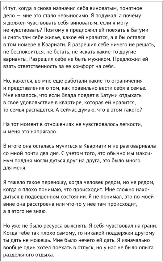 Конечно, совсем мирно и спокойно разойтись у нас не получилось. За отрицанием пробивались подавленные чувства раздражения и гнева. Хотя мы и договорились закончить отдых «нормально» и не обсуждать причины нашего «провала», у нас в первые дни ничего не получалось. Каждый разговор заканчивался претензиями друг к другу, которые мы раньше не озвучивали.