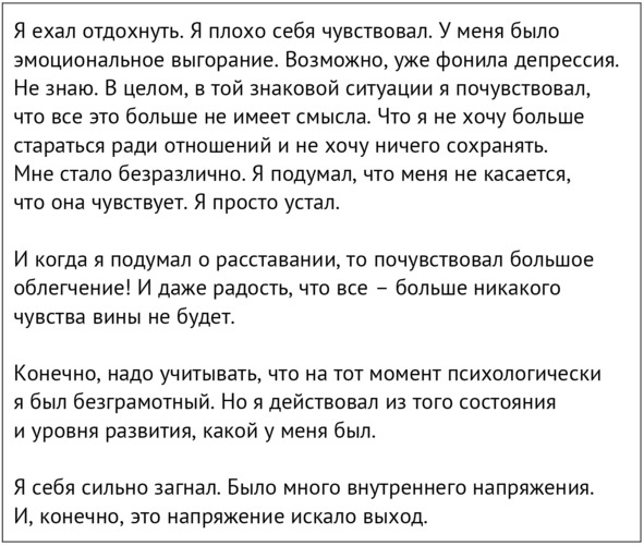 Ничего себе… Последнее высказывание меня поразило. А я и не заметила… Получается, что он специально решил мне мстить за холодность, вместо того чтобы поговорить? Разве в этом есть хотя бы немного доверия, которое должно быть между близкими людьми? Мне было тяжело, я была вся в тревогах, а он еще и мстил мне! Я и подумать не могла, что он будет намеренно делать такое – и просто решила, что наши отношения изжили себя. Ужасная подлость!