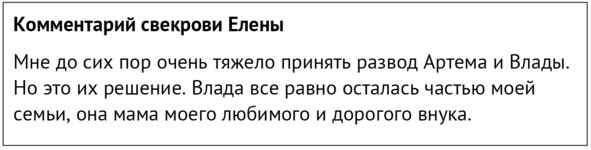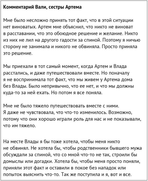 Я тоже переживала, как отнесутся ко мне мама и сестра Артема после новости о расставании. Мы всегда были в теплых отношениях. Я знала его сестру еще с того момента, когда она была маленькой десятилетней девочкой, и понимала, что наш развод ее очень расстроит. Это было больно. Но, к счастью, ни свекровь, ни сестра не только не отвернулись от меня, но и не сказали ни одного плохого слова и не задали ни одного лишнего вопроса (и вообще ни одного вопроса). Я получила только принятие и поддержку, за что была очень им благодарна.