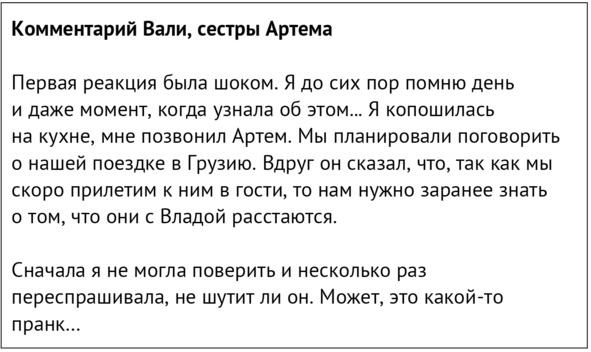Так получилось, что младшая сестра Артема Валя со своим парнем Владом должна была приехать к нам в гости в Тбилиси как раз в тот момент, когда я выбирала квартиру. Мы договаривались об их визите за несколько месяцев, когда еще не планировали разводиться. Они летели к нам в гости как к семье, поэтому я переживала, как они воспримут новость о расставании. Вале, как сестре, первым сообщил Артем. Она поделилась воспоминаниями об этом.