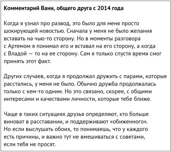 Я понимаю, что и нашим друзьям было нелегко определиться, как с нами общаться дальше. Для старых друзей наше расставание тоже стало шоком. Но, тем не менее, они пережили этот период вместе с нами и сохранили общение с нами обоими. Например, мы в течение десяти лет дружили с другой супружеской парой – Ваней и Катей. Мы продолжили дружбу и после развода, только я стала больше общаться с Ваней, а Катя – с Артемом.