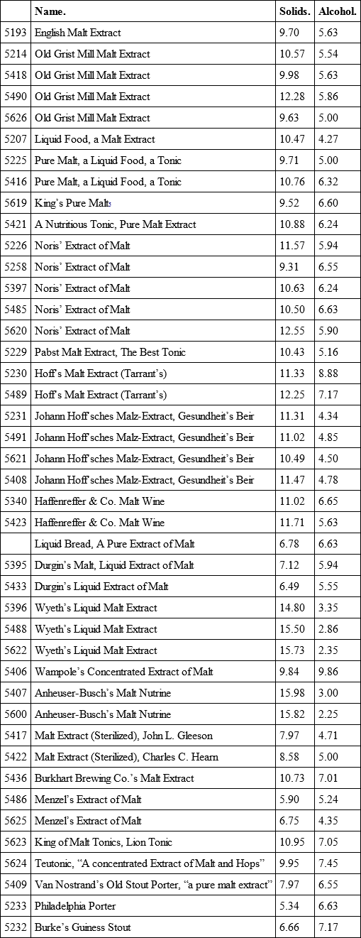 “Boston, Mass., March 20, 1897.“I enclose a list of the malt extracts examined in this office during the past year or two. These samples were all in original packages, obtained by officers in various parts of Eastern Massachusetts. They probably very fairly represent the various malt extracts on the market. I have added two samples of Porter and one of Old Brown Stout for purposes of comparison.