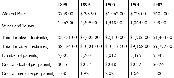 Garfield Memorial, Washington, D. C., sent figures for ten years. For 1899 the cost of liquors was $490.08, with a steady decrease to 1908 when the cost was $274.58. Number of patients in 1899 was 1,171; in 1908, 1,898 patients. The per capita for 1908 was .144 cents.