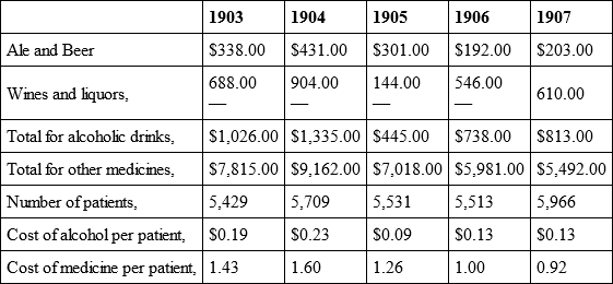 Massachusetts Homeopathic Hospital, Boston, sent figures for five years. For 1904 the cost of alcoholic liquors was $197.69 with 3,720 patients; for 1908, the cost was $69.82 with 4,543 patients. The per capita cost for the five years is as follows: 1904, cost .0531 cents; 1905, cost .0474; 1906, cost .034; 1907, cost .0171; 1908, cost .0153.
