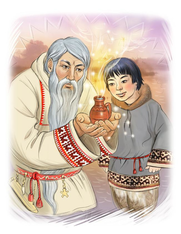 Everyone nodded in approval, and all the children beamed: they loved Yotkhee because he always had time for them, playing their games and telling them all sorts of fascinating stories which he either had heard from grown-ups or made up on the spot. He often took them to the river and taught them to swim in the clear blue water, all radiant in the rays of the Spirit of Light.