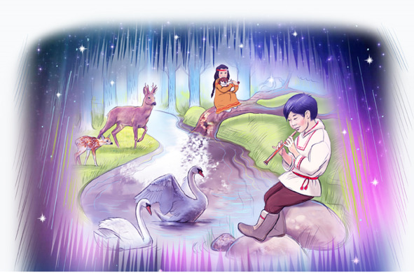 Yotkhee put the reed pipe to his lips and started playing a soft tune. As soon as the music began, a doe with her fawn came out from behind the thick bushes on the opposite bank and stopped at the water, lifting its left front leg slightly and perking up its ears to listen to the song. Several noble-looking swans delicately glided onto the clear blue water, gently spreading their large wings.