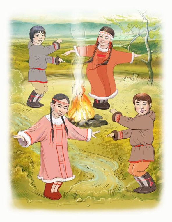 When the first rays of the morning sun tickled the eyelashes of the sleeping travelers, the young shaman was already up and busy making his fire. The grownups stretched, yawned, and quickly got up, while the children pulled their blankets over their heads and turned over on the other side, trying to snatch a few more precious moments of sleep.