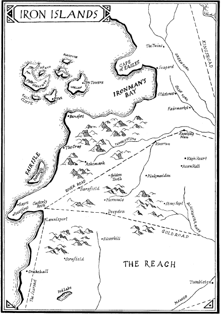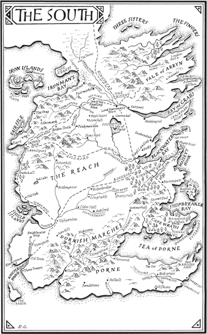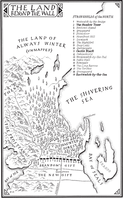 The dogs pulled at him as they made their way through the trees. Chett could see the Fist punching its way up through the green. The day was so dark that the Old Bear had the torches lit, a great circle of them burning all along the ringwall that crowned the top of the steep stony hill. The three of them waded across a brook. The water was icy cold, and patches of ice were spreading across its surface. “I’m going to make for the coast,” Lark the Sisterman confided. “Me and my cousins. We’ll build us a boat, sail back home to the Sisters.”