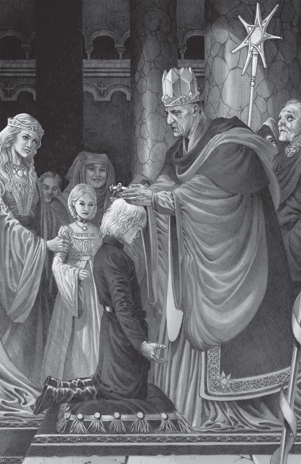 Grand Maester Benifer wrote afterward that the meeting between the boy king and the outlaw knight “set the table” for all of Jaehaerys’s reign to follow. When Ser Joffrey and Lady Lucinda urged him to undo his uncle Maegor’s decrees and reinstate the Swords and Stars, Jaehaerys refused firmly. “The Faith has no need of swords,” he declared. “They have my protection. The protection of the Iron Throne.” He did, however, rescind the bounties that Maegor had promised for the heads of Warrior’s Sons and Poor Fellows. “I shall not wage war against my own people,” he said, “but neither shall I tolerate treason and rebellion.”