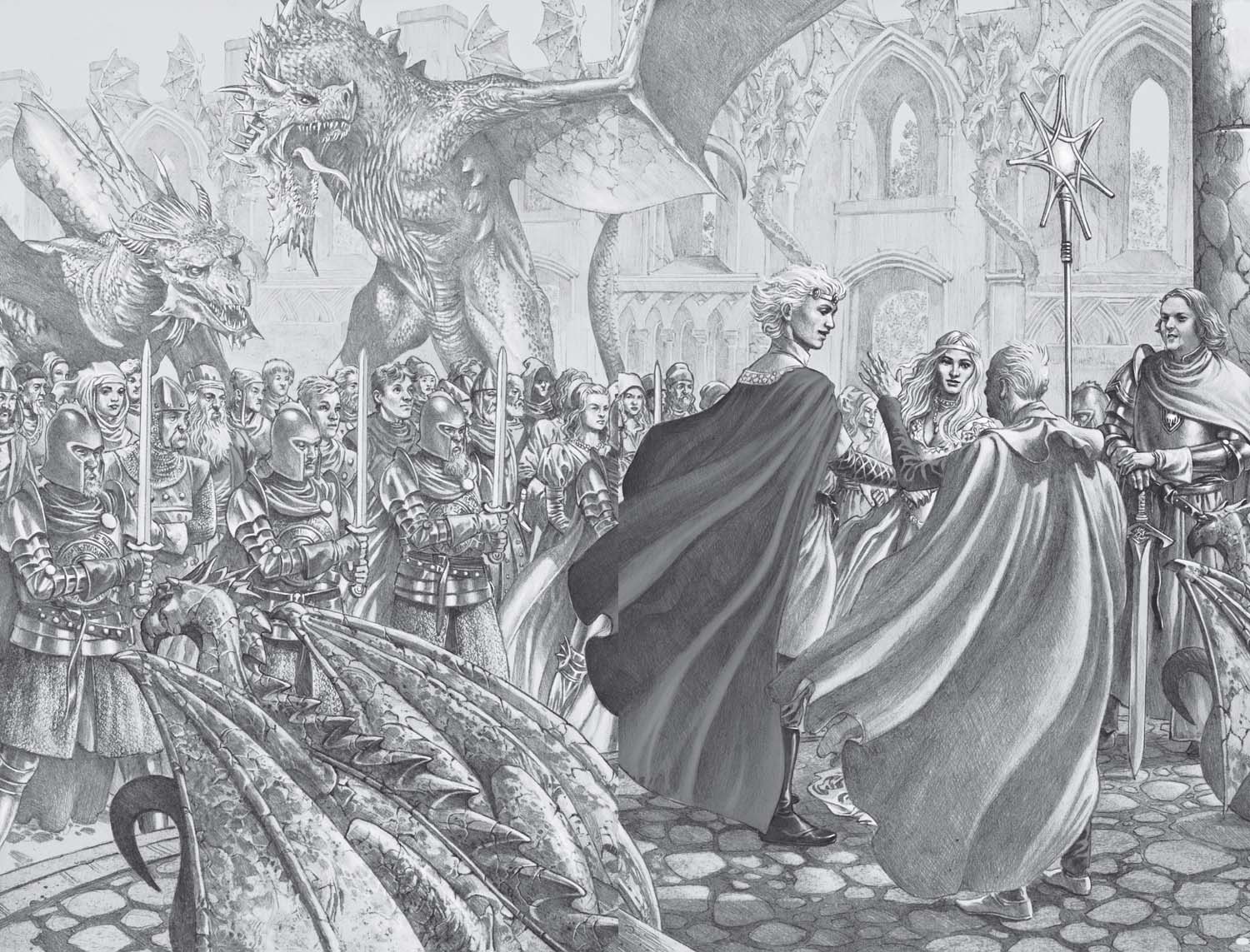 When the day of the wedding finally arrived, more than forty thousand smallfolk ascended the Hill of Rhaenys to the Dragonpit to bear witness to the union of the Queen Regent and the Hand. (Some observers put the count even higher.) Thousands more cheered Lord Rogar and Queen Alyssa in the streets as their procession made its way across the city, attended by hundreds of knights on caparisoned palfreys, and columns of septas ringing bells. “Never has there been such a glory in all the annals of Westeros,” wrote Grand Maester Benifer. Lord Rogar was clad head to heel in cloth-of-gold beneath an antlered halfhelm, whilst his bride wore a greatcloak sparkling with gemstones, with the three-headed dragon of House Targaryen and the silver seahorse of the Velaryons facing one another on a divided field.