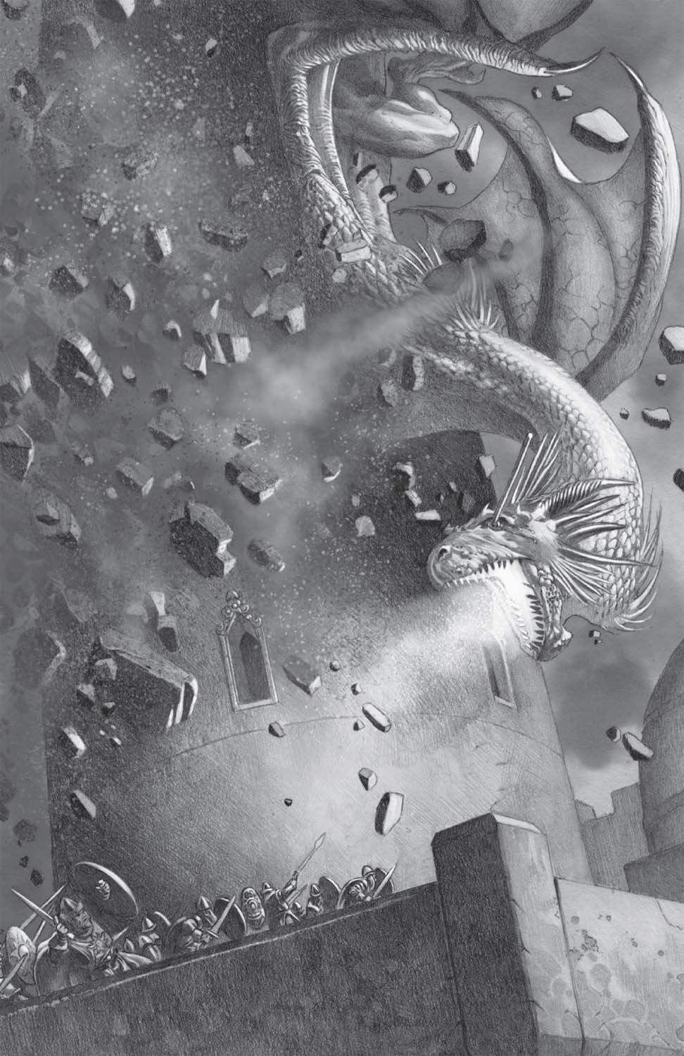 Once again the king unleashed his dragons against Dorne. Aegon himself fell upon Skyreach, vowing to make the Fowler seat “a second Harrenhal.” Visenya and Vhagar brought fire and blood to Starfall. And Rhaenys and Meraxes returned once more to the Hellholt … where tragedy struck. The Targaryen dragons, bred and trained to battle, had flown through storms of spears and arrows on many occasions, and suffered little harm. The scales of a full-grown dragon were harder than steel, and even those arrows that struck home seldom penetrated enough to do more than enrage the great beasts. But as Meraxes banked above the Hellholt, a defender atop the castle’s highest tower triggered a scorpion, and a yard-long iron bolt caught the queen’s dragon in the right eye. Meraxes did not die at once, but came crashing to earth in mortal agony, destroying the tower and a large section of the Hellholt’s curtain wall in her death throes.