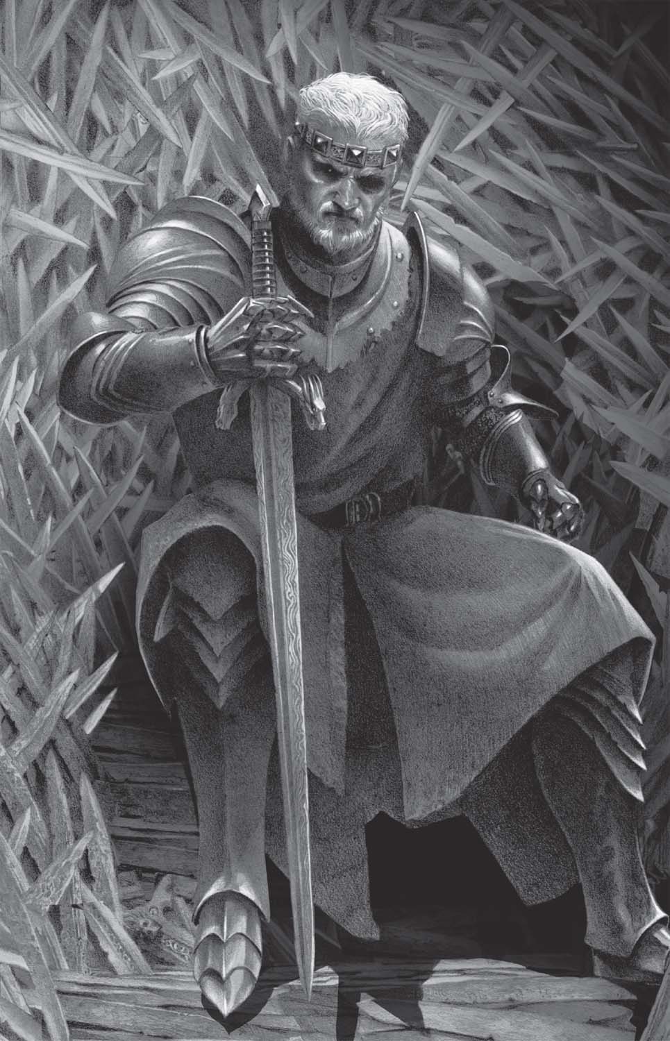 Dick Bean died first, cut down by Lyle Bracken mere instants after the combat began. Thereafter accounts differ markedly. One chronicler says that when the hugely fat Ser Guy the Glutton was cut open, the remains of forty half-digested pies spilled out. Another claims Ser Garibald of the Seven Stars sang a paean as he fought. Several tell us that Lord Massey hacked off the arm of Harry Horpe. In one account, Death’s Head Harry tossed his battle-axe into his other hand and buried it between Lord Massey’s eyes. Other chroniclers suggest Ser Harys simply died. Some say the fight went on for hours, others that most of the combatants were down and dying in mere moments. All agree that great deeds were done and mighty blows exchanged, until the end found Maegor Targaryen standing alone against Damon the Devout and Willam the Wanderer. Both of the Warrior’s Sons were badly wounded, and His Grace had Blackfyre in his hand, but even so, it was a near thing. Even as he fell, Ser Willam dealt the king a terrible blow to the head that cracked his helm and left him insensate. Many thought Maegor dead until his mother removed his broken helm. “The king breathes,” she said. “The king lives.” The victory was his.