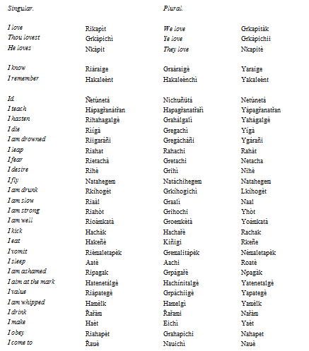 Hapagřanatřan, I teach. Neapagřan, I teach myself. Hapagřankátápegetà, we teach one another. Hapagrani, I teach thee. Riápagřani, thou teachest me. Riapagřan, he teaches me. Yapagřan, he teaches him.