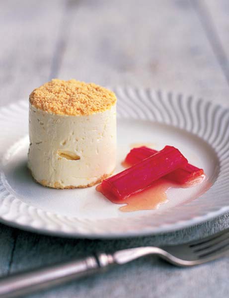To serve, crush the shortbread to fine crumbs and remove the cheesecakes from the fridge. Roll the top and bottom of each cake in the biscuit crumbs and place on a plate. Then, using either a warm tea towel or a cook’s blowtorch, warm the rings slightly and they should just lift off. Serve with the rhubarb on the side and drizzle with some of the juices from the dish.