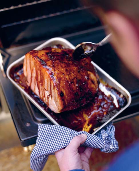 If you wish to warm the meat, place the whole ham or the slices on a baking tray and spoon half of the glaze over the top. Put in a preheated oven at 170°C (325°F), Gas 3, for 1 hour if the ham is whole or, if it is ready-sliced, until heated through. Remove from the oven and, if necessary, carve the ham into slices.