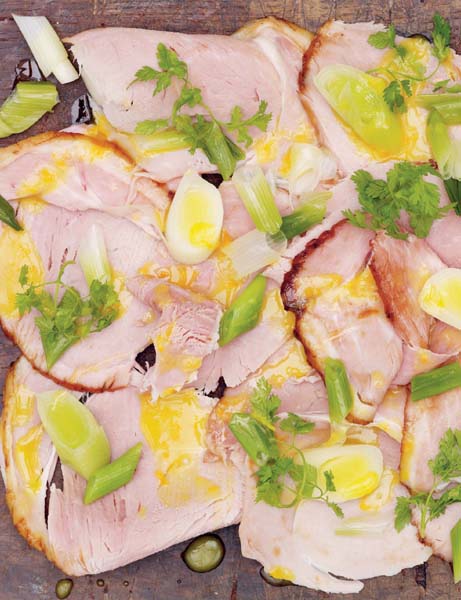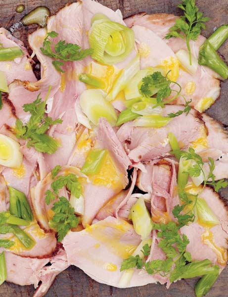 Place the sliced ham on a board or platter, then slice the leek into 1cm (½in) rounds and the spring onion into bite-sized lengths. Arrange these on the ham, drizzle with the rest of the glaze, place a few chervil leaves on top and serve.