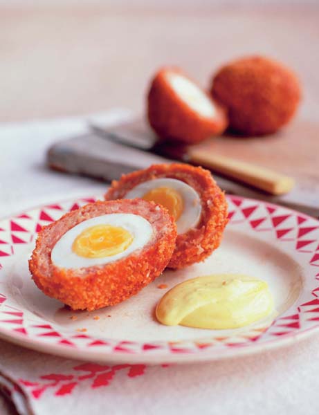 If using a deep-fat fryer, heat the vegetable oil to 150°C (300°F) – not too hot or the eggs will explode and the meat will not cook through. Alternatively, fill a deep, heavy-based frying pan to a depth of 2cm (¾in) with oil and use a sugar thermometer to check that it has reached the correct temperature. Carefully lower the Scotch eggs into the oil and cook for 5–7 minutes.