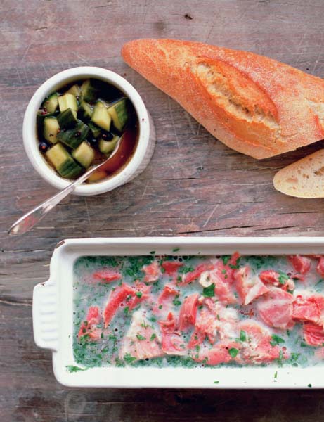To serve, take the terrine from the fridge, remove the cling film and accompany with pickled cucumber and crusty bread.