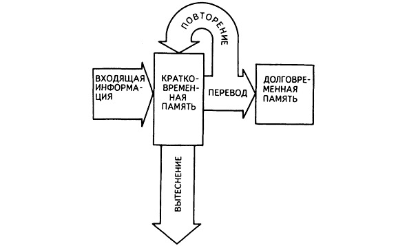 Схема памяти по Р. Аткинсону и Р. Шифрину. Взаимосвязанная работа кратковременной и долговременной памяти, включающая вытеснение, повторение и кодирование, как частные процессы, составляющие работу памяти.