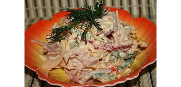 Способ приготовления: Твердый сыр потереть на мелкой терке, остальные ингредиенты порезать мелкими кубиками. Все заправить майонезом.