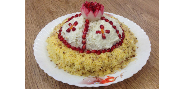Сверху салат украшать зернами граната и зеленым горошком. На верх поставить корону из белка вареного яйца, посыпать зернами граната.